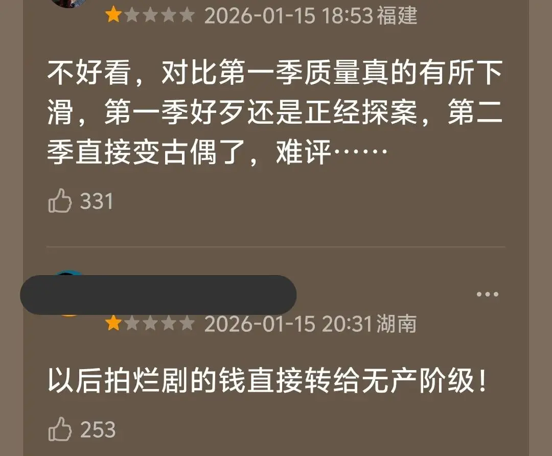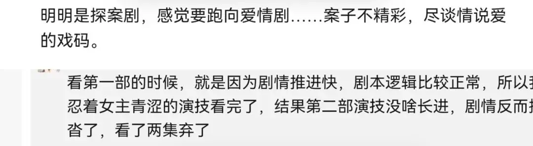 大家觉得相比第1季剧情的紧凑高能,本季“三集一个案件也没推理完,净撒糖了”,分不清主次,拍的太浅。剧集节奏把控不行,拖拖沓沓,缺乏强钩子。