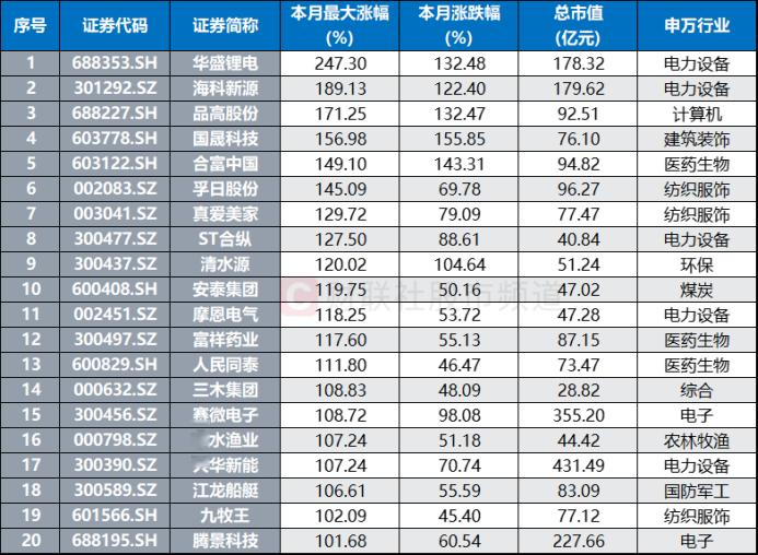 具体个股来看,剔除本月上市新股,月内获翻倍行情的个股中,华盛锂电月内最大涨幅唯一录得2倍以上,达247.30%。同时,海科新源、品高股份、国晟科技、合富中国、孚日股份、真爱美家、ST合纵、清水源等股也表现活跃。若仅以月内涨幅统计,国晟科技、合富中国、华盛锂电、品高股份、海科新源、清水源5股本月涨幅在100%以上。